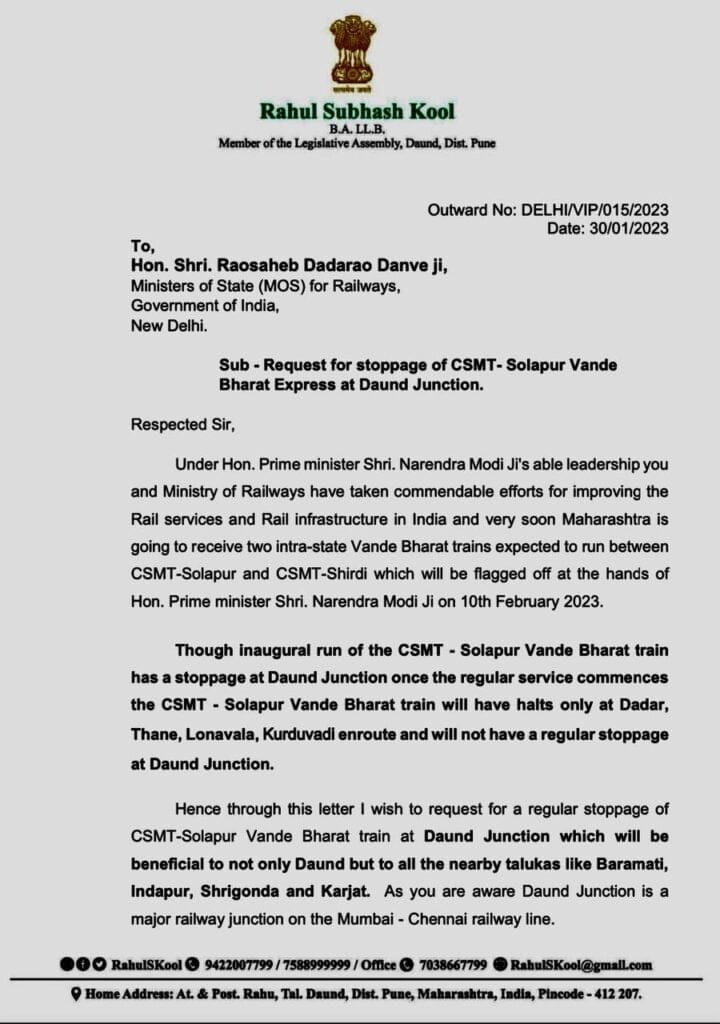 छत्रपती शिवाजी महाराज टर्मिनस मुंबई ते सोलापूर वंदे भारत ट्रेन दौंड तसेच आजुबाजूच्या बारामती, इंदापूर, श्रीगोंदा आणि कर्जत या तालुक्यांना देखील सोयीची ठरेल विशेषत: व्यापारी, सरकारी अधिकारी, कामगार व विद्यार्थ्यांना या ट्रेनचा मोठा फ़ायदा होईल याबाबत माननीय रेल्वे राज्यमंत्री सकारात्मक निर्णय घेतील असा विश्वास आमदार राहुल कुल यांनी व्यक्त केला आहें