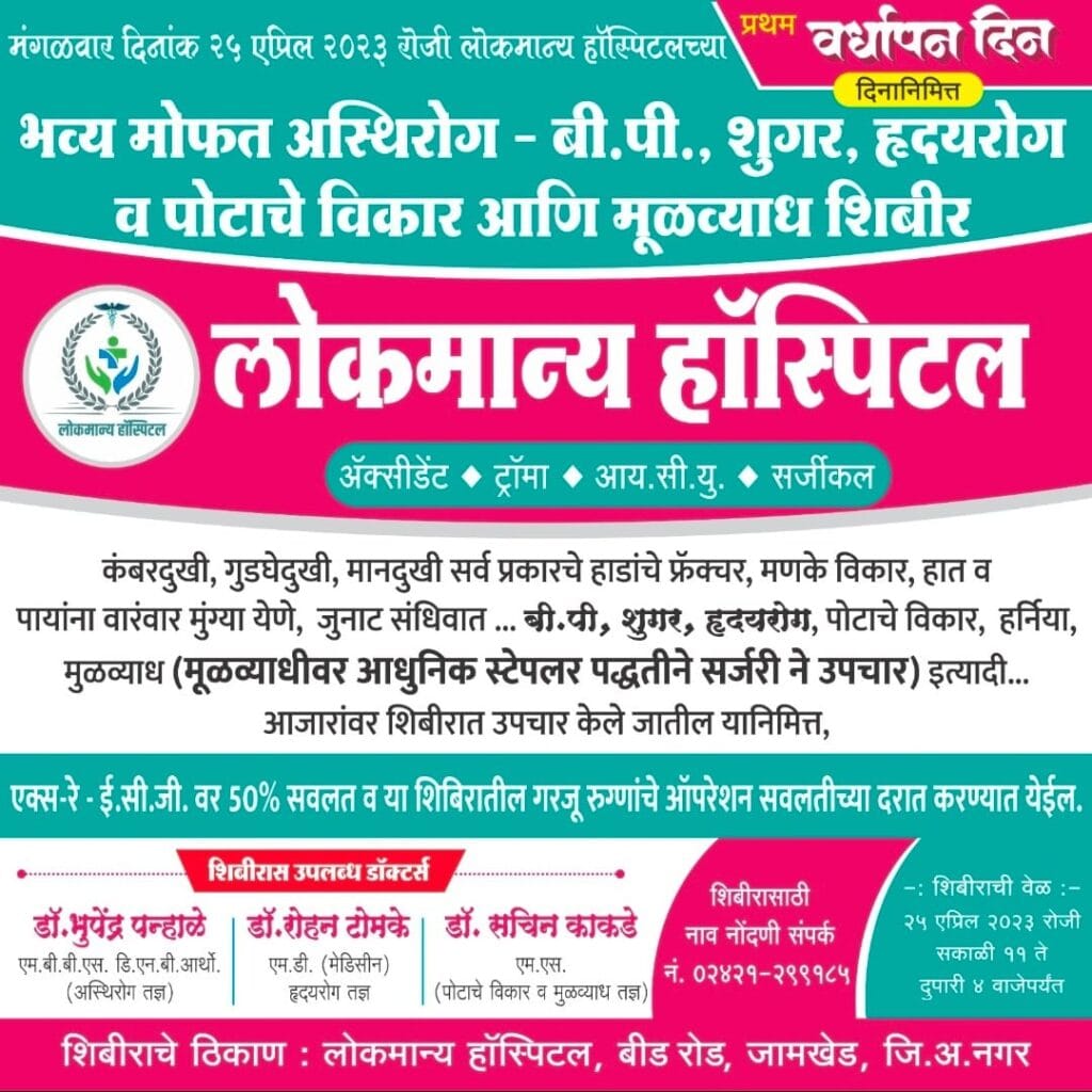 जामखेड शहरातील लोकमान्य हॉस्पिटलच्या वतीने प्रथम वर्धापनदिनानिमित्त मोफत आरोग्य शिबीराचे आयोजन मंगळावर दि. २५ एप्रिल २०२३ रोजी भव्य मोफत अस्थिरोग, बी. पी., शुगर, हृदयरोग व पोटाचे विकार आणि मुळव्याध मोफत शिबीराचे करण्यात आले आहे तरी गरजू रुग्णांनी या शिबीराचा लाभ घ्यावा असे आवाहन हॉस्पिटलच्या वतीने करण्यात आले आहे.