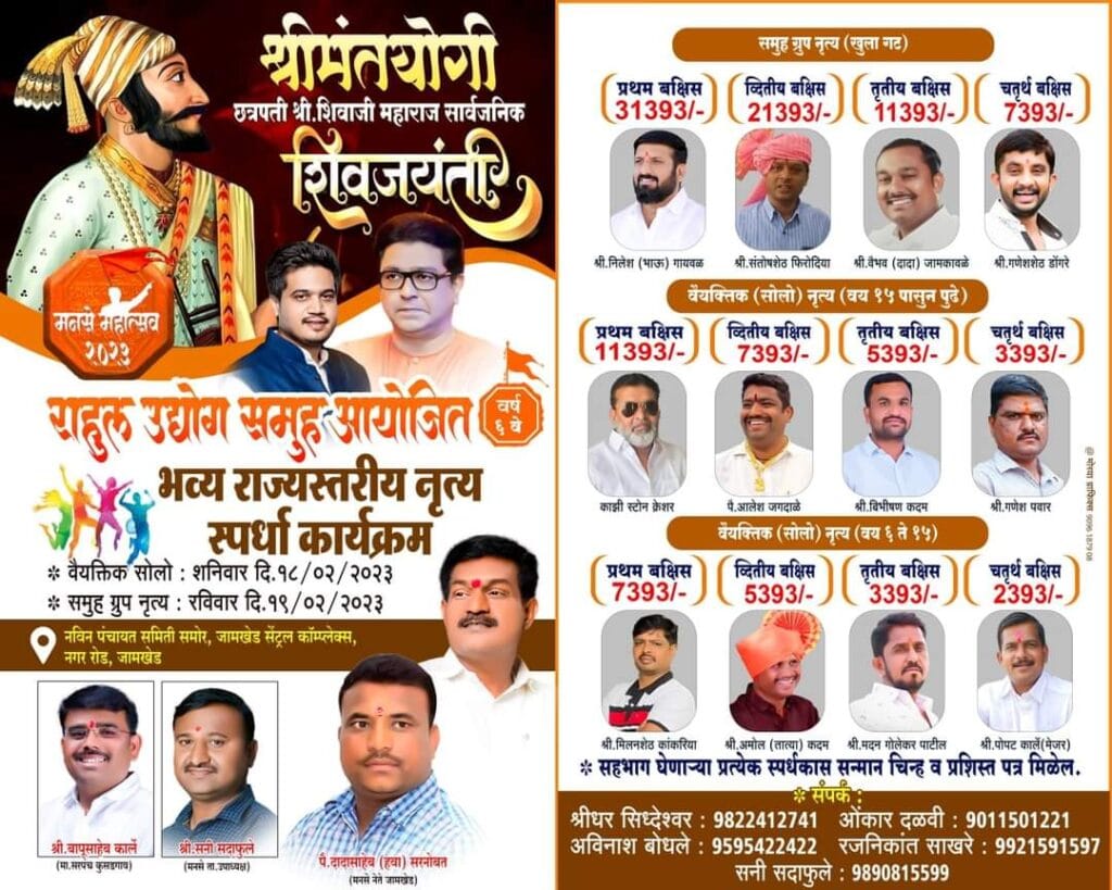 जामखेड शहरातील जामखेड सेंट्रल पंचायत समिती समोर असलेल्या प्रागंणात दि १८ फेब्रुवारी रोजी वैयक्तिक लहान गट नृत्य स्पर्धा व वैयक्तिक मोठा गट नुत्य स्पर्धा तर १९ फेब्रुवारी रोजी समूह ग्रुप स्पर्धाचे आयोजन करण्यात आले असून दि १९ रोजी सकाळी दहा वाजता छत्रपती श्री शिवाजी महाराज यांच्या प्रतिमेचे पूजन आमदार रोहित पवार यांच्या हस्ते करण्यात येणार आहे.या कार्यक्रमास प्रमुख पाहुणे तहसिलदार योगेश चंद्रे,पोलीस निरीक्षक संभाजी गायकवाड, गटविकास अधिकारी प्रकाश पोळ उपस्थित राहणार आहेत.