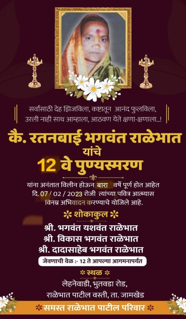 जामखेड नगरपालिकेचे प्रथम नगराध्यक्ष माननीय विकास तात्या यांच्या आई कै. रतनबाई भगवंत राळेभात यांचे 12 वे पुण्यस्मरण दिनांक 07/02/2023 रोजी योजिले आहे , त्यांच्या पवित्र आत्म्यास विनम्र अभिवादन करण्यासाठी सर्वांनी यावे