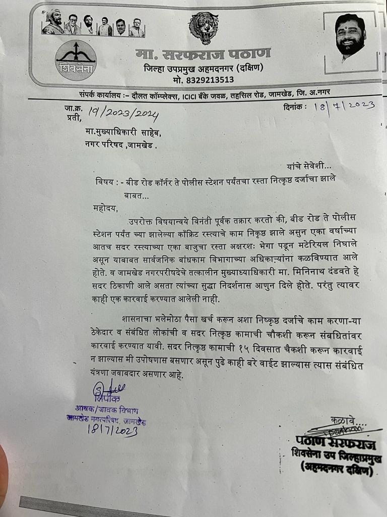 सोमवार दिनांक १७ व १८ जुलै २०२३ रोजी उप अभियंता सार्वजनिक बांधकाम विभाग चे शशिकांत सुतार व जामखेड नगर परिषदे चे मुख्याधिकारी अजय साळवे यांना बीड रोड ते पोलीस स्टेशन पर्यंत च्या झालेल्या कॉँक्रिट रस्त्याचे निकृष्ट दर्जाचे कामाबाबत निवेदन देण्यात आले.यावेळी शिवसेना जिल्हा उपप्रमुख सरफराज पठाण, अल्पसंख्याक जिल्हा अध्यक्ष मुस्तफा (मेजर) शेख, अल्पसंख्याक तालुका अध्यक्ष मोहसिन सय्यद , भैय्या शेख आदी उपस्थित होते.
