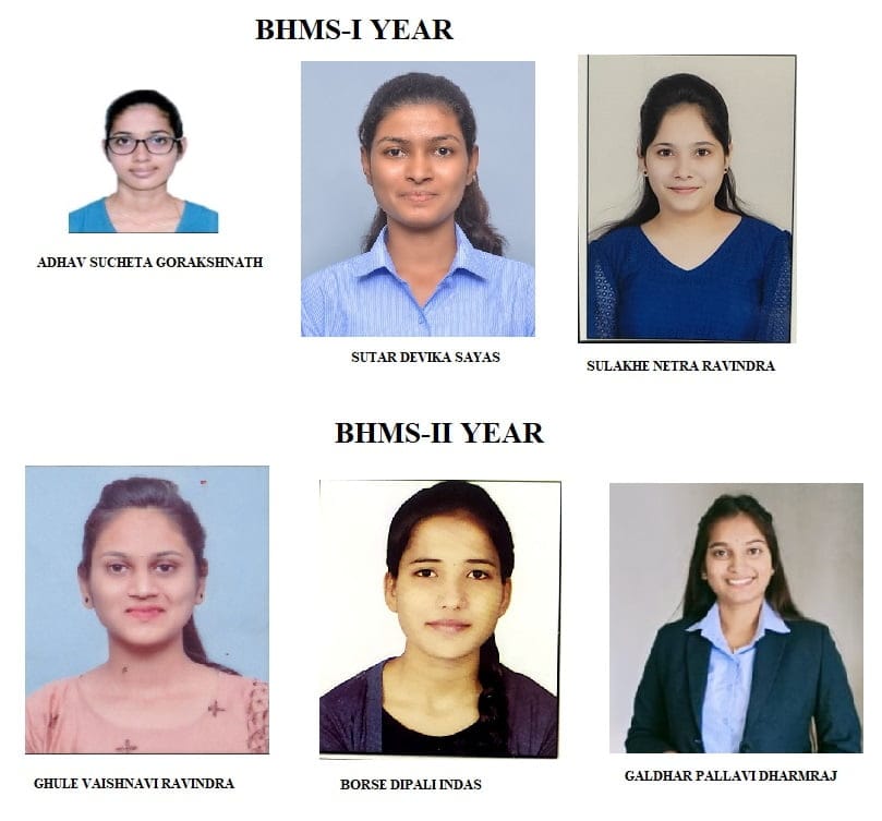 बीएचएमएस प्रथम वर्षामध्ये अनुक्रमे कु.सुचिता गोरक्षनाथ आढाव -प्रथम,कु.देविका सुतार द्वितीय व कु.नेत्रा सुलाखे तृतीय क्रमांकाने याउत्तीर्ण झाल्या आहेत.बीएचएमएसच्या द्वितीय वर्षामध्ये अनुक्रमे कु.वैष्णवी घुले-प्रथम,कु.दिपाली बोरसे-द्वितीय व कु.पल्लवी गलधर-तृतीय क्रमांकाने उत्तीर्ण झाल्या आहेत. सर्व विद्यार्थ्यांना संस्थेचे अध्यक्ष डॉ.भास्कर मोरे पाटील व सेक्रेटरी डॉ.सौ.वर्षा मोरे पाटील यांच्यासह प्रा.डॉ.सर्फराज खान,प्रा.डॉ.झेबिया शेख,डॉ.संदीप सांगळे,डॉ.दिपाली सांगळे,डॉ.मनिषा बांगर, डॉ.श्रध्दा मुळे, डॉ.गफ्फार शेख,डॉ.सोनाली यादव,डॉ बाबासाहेब यादव, डॉ.कमल यादव, डॉ. संजय झिने,डॉ. सौ.वैशाली झिने,सौ.प्रज्ञा पुजारी,सौ.आयुषा खेडकर,सौ.वर्षा ढेरे, कु.पुजा खडताळे आदींचे मार्गदर्शन लाभले.