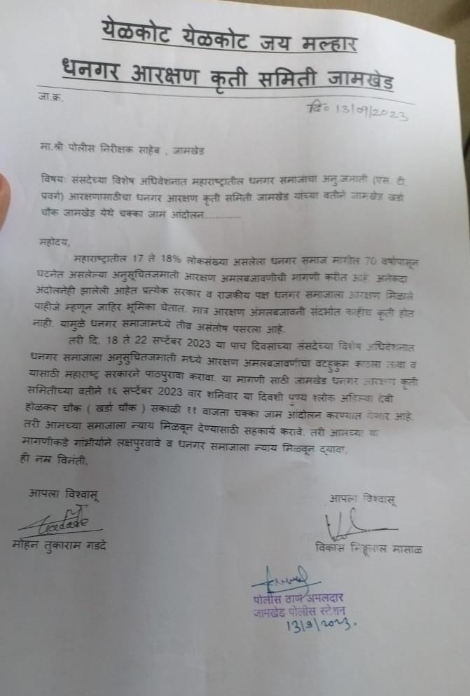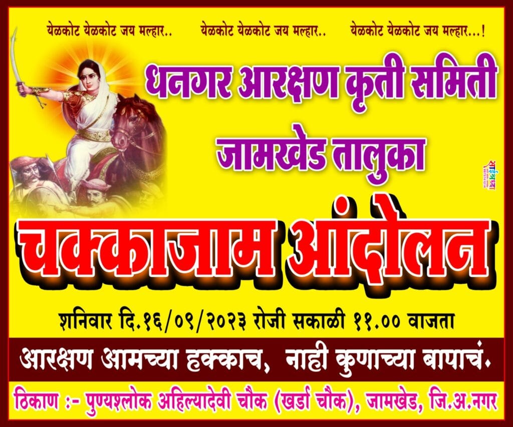 यामुळे धनगर समाजामध्ये तीव्र असंतोष पसरला आहे. तरी दि. 18 ते 22 सप्टेंबर 2023 दिवसाच्या संसदेच्या विशेष अधिवेशनात धनगर समाजाला अनुसुचितजमाती मध्ये आरक्षण अंमलबजावणीचा वटहुकुम काढला जावा व यासाठी महाराष्ट्र सरकारने पाठपुरावा करावा. या मागणी साठी जामखेड धनगर आरक्षण कृती समितीच्या वतीने १६ सप्टेंबर 2023 वार शनिवार या दिवशी पुण्य श्लोक अहिल्या देवी होळकर चौक ( खर्डा चौक ) सकाळी ११ वाजता चक्का जाम आंदोलन करण्यात येणार आहे. तरी आमच्या समाजाला न्याय मिळवून देण्यासाठी सहकार्य करावे. तरी आमच्या या मागणीकडे गांभीर्याने लक्ष पुरवावे व धनगर समाजाला न्याय मिळवून द्यावा.