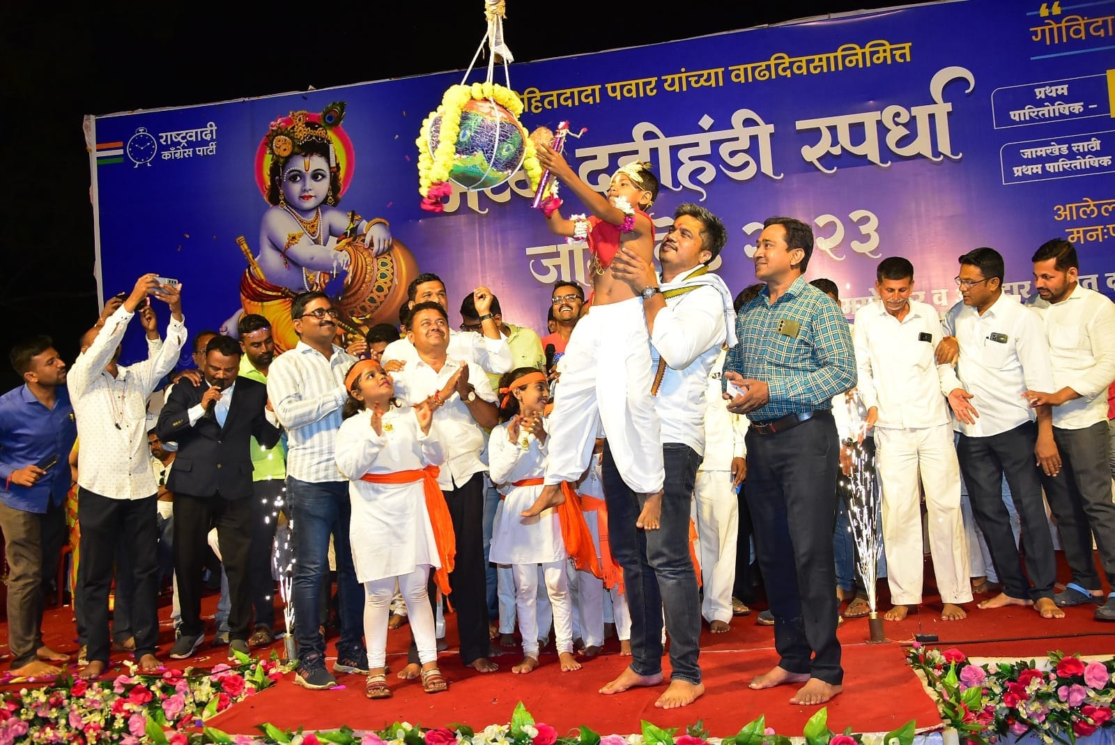 यंदाच्या वर्षी मात्र नागरिक, स्थानिक कार्यकर्ते, पदाधिकारी आणि आमदार रोहित पवार मित्र मंडळ यांनी मिळून भव्य दही हंडी स्पर्धेचे आयोजन केले होते. हजारोंच्या संख्येनं परिसरातील नागरिक, महिला, अबालवृद्ध असे सर्वजण या सोहळ्याचे साक्षीदार होण्यासाठी आवर्जून उपस्थित होते. विशेष म्हणजे महिला आणि मुलींची या कार्यक्रमाला मोठ्या संख्येनं उपस्थिती असल्याचे पाहायला मिळाले कारण महिलांसाठी विशेष बैठक व्यवस्था या कार्यक्रमादरम्यान करण्यात आली होती.