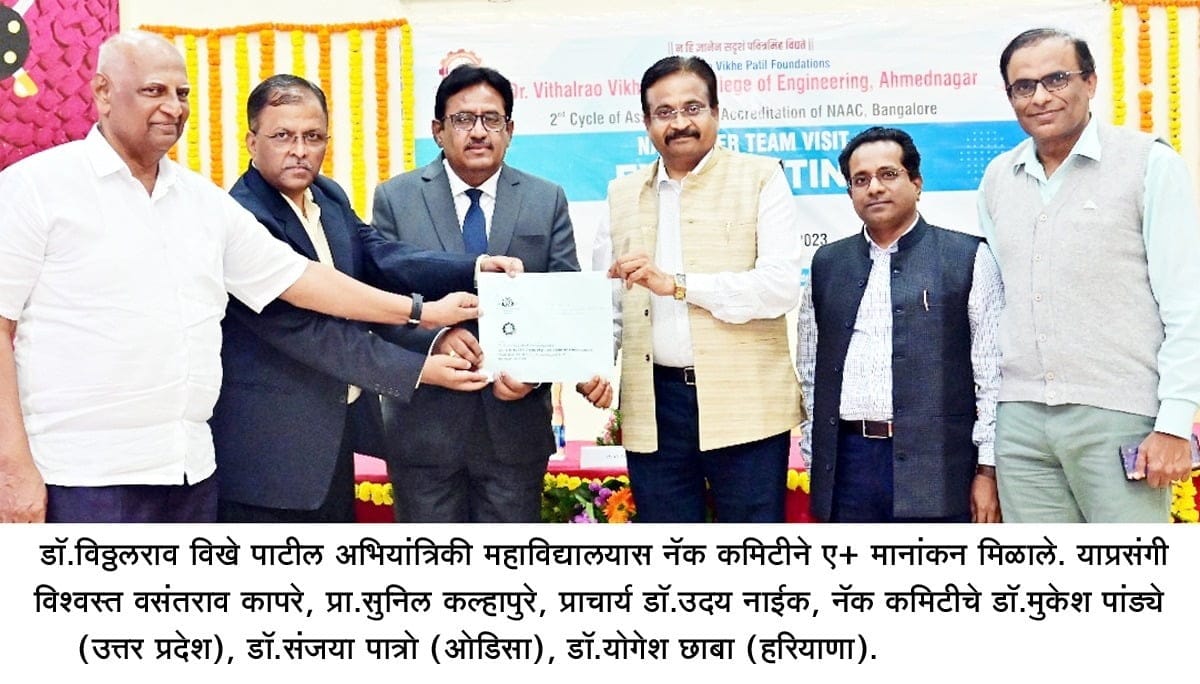 विळद घाट येथील डॉ.विठ्ठलराव विखे पाटील अभियांत्रिकी महाविद्यालयास नॅक कमिटीचे ए+ मानांकन प्रमाणपत्र मिळाले याप्रसंगी फौंडेशनचे उपसंचालक प्रा.सुनिल कल्हापुरे, प्राचार्य डॉ.उदय नाईक, डॉ.अंकुश शिर्के, डॉ.रविंद्र नवथर, विभागप्रमुख, शिक्षक, शिक्षकेतर कर्मचारी उपस्थित होते.