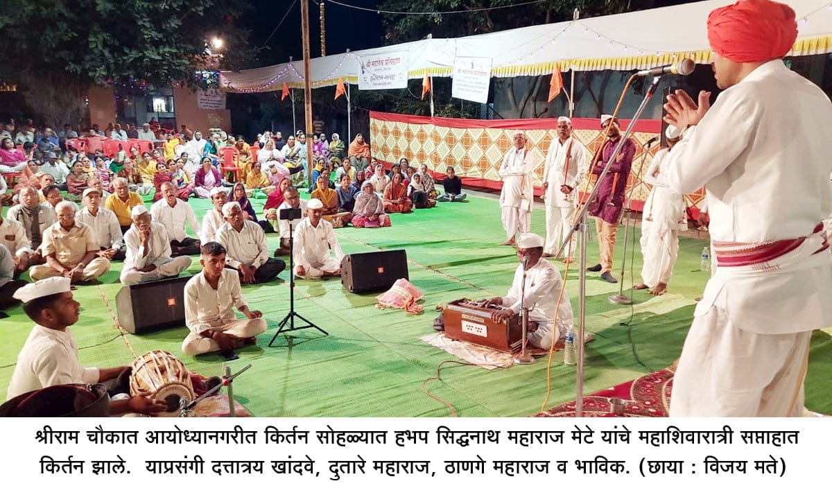 पाईपलाईन(Piplineroad) रोडवरील श्रीराम चौकात आयोध्यानगरीत महाशिवरात्री उत्सवानिमित्त सुरु असलेल्या सप्ताहात किर्तन सोहळ्यात हभप सिद्धनाथ मेटे महाराज यांचे किर्तन झाले. यावेळी भाविकांची गर्दी होती. किर्तनात हार्मोनियम वादक दत्तात्रय खांदवे, पखवाज वादक हभप ठाणगे महाराज, गोरक्षनाथ महाराज दुतारे व टाळकर्यांनी साथ दिली.