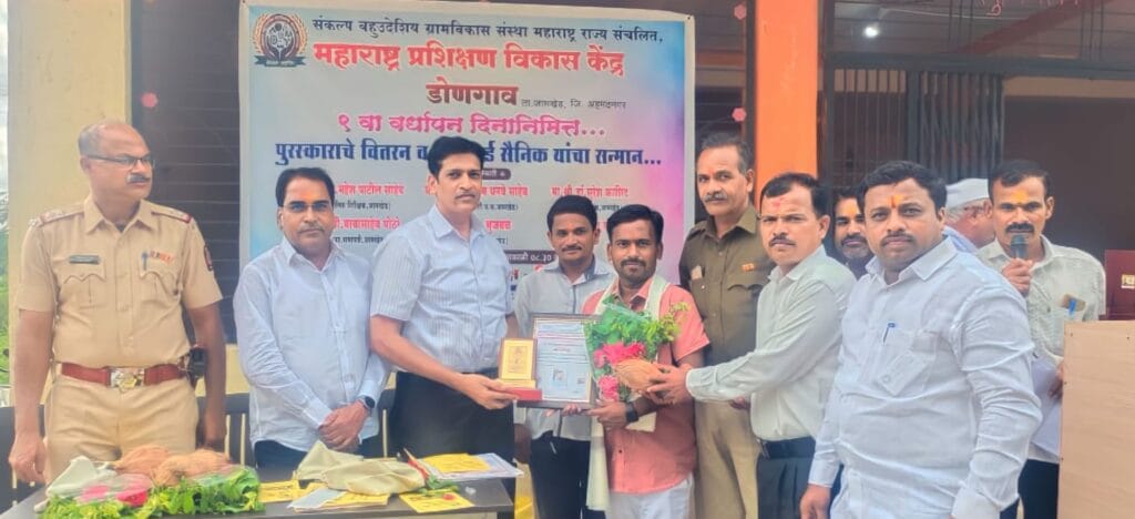 जामखेड तालुक्यातील डोणगाव येथील संकल्प बहुउद्देशीय ग्रामविकास संस्था महाराष्ट्र राज्य संचलित, महाराष्ट्र प्रशिक्षण विकास केंद्र डोणगाव यांच्या ९ व्या वर्धापन दिनानिमित्त विविध सामाजिक शैक्षणिक क्षेत्रातील मान्यवरांना उल्लेखनीय कार्य बद्दल पुरस्कार तसेच होमगार्ड सैनिक यांचा सन्मान सोहळा आयोजित करण्यात आला होता.कार्यक्रमाची सुरुवात विश्वरत्न डॉ.बाबासाहेब आंबेडकर यांच्या प्रतिमेचे पूजन करून अभिवादन करण्यात आले.