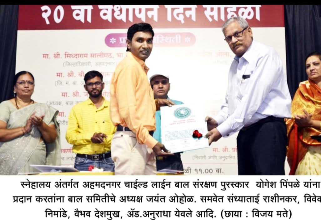 नगर – एमआयडीसी येथील स्नेहालयात चाईल्ड लाईनच्या 20 वर्धापन दिनानिमित्त बाल संरक्षण 2023 च्या पुरस्काराने योगेश पिंपळे यांना प्रशस्तीपत्रक, स्मृतीचिन्ह, पुस्तके भेट देऊन गौरविण्यात आले. या प्रसंगी बालकल्याण समिती अध्यक्ष ॲड जयंत ओहोळ अॅड.अनुराधा येवले, अॅड.प्रज्ञा हेेंद्रे, अॅड. भाग्यश्री जरंडीकर, संध्या राशिनकर, हनीफ शेख, शाम असावा, प्रविण मुत्याल, दत्तात्रय कवळे, विकेश निमांडे, वैभव देशमुख, राजेंद्र वारे, संजय गुगळे, राजीव गुजर आदि उपस्थित होते.