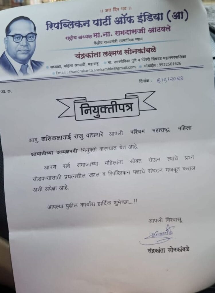 रिपब्लिकन पक्षाचे राष्ट्रीय अध्यक्ष तथा केंद्रीय सामाजिक न्याय मंत्री रामदासजी आठवले साहेब यांच्या आदेशावरून पश्चिम महाराष्ट्राच्या महिला आघाडीच्या अध्यक्षपदी शशिकलाताई वाघमारे यांची निवड करण्यात आल्याचे पत्र पक्षाच्या महिला आघाडी प्रदेशाध्यक्ष चंद्रकांता सोनकांबळे यांनी निवडीचे पत्र दिले असून त्यांच्या निवडीचे स्वागतचे केंद्रीय मंत्री नामदार रामदास आठवले साहेबांनी दूरध्वनी वरून अभिनंदन करून पुढील कार्यास शुभेच्छा दिल्या आहेततसेच पक्षाच्या राष्ट्रीय नेत्या सीमाताई आठवले यांनी अभिनंदन करून पुढील कार्यास शुभेच्छा देऊन सर्व जातीसर्व जाती-धर्माच्या महिलांना न्याय देण्याचे व पक्षाच्या कार्यकारिणीमध्ये स्थान देण्याचे आदेश दिले आहेत.
