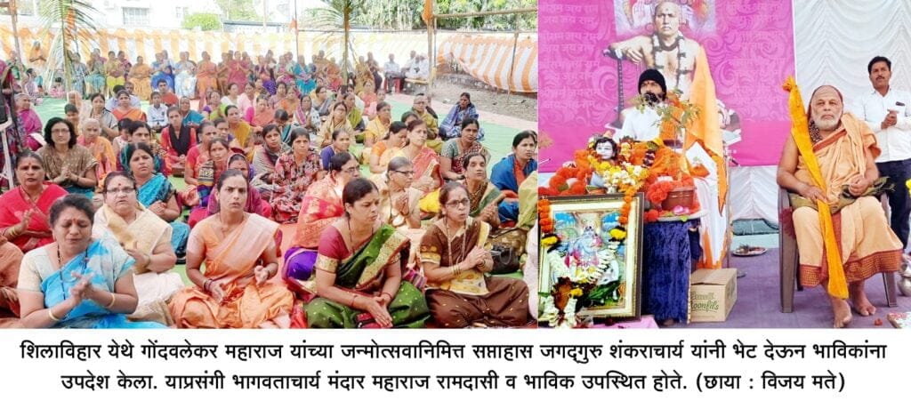 सावेडी उपनगरात शिलाविहार येथील ब्रह्मचैतन्य गोंदवलेकर महाराज यांच्या मंदिरात जयंतीनिमित्त सुरु असलेल्या अखंड हरिनाम सप्ताह, भागवत कथा सोहळ्यास जगद्गुरू शंकराचार्य यांनी उपस्थित राहून उपदेश केला. यावेळी भागवत कथा मंदार महाराज रामदासी, हभप सुंदरदास रिंगणे, हभप सौ.रेखाताई रिंगणे, प्रसाद देवा, अशोक मुळे, लहू बडे , संतोष भोंग, विजय मते, सेवा भावी मंडळाचे कार्यकर्ते आदि उपस्थित होते.