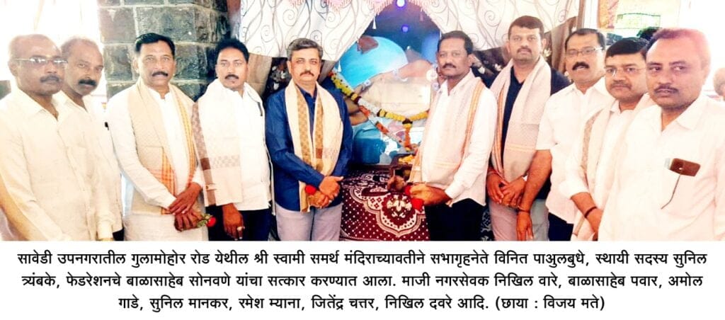 सावेडी उपनगरातील भाविकांचे श्रद्धास्थान असलेल्या श्री स्वामी समर्थ मंदिराच्यावतीने मनपा सभागृह नेतेपदी विनित पाउलबुधे यांची तर स्थायी समिती समिती सदस्यपदी निवड झालेले सुनिल त्र्यंबके यांचा तसेच वेळोवेळी मंदिर उभारणीसाठी, प्रवेशद्वाराकरीता सहकार्य करणारे माजी नगरसेवक निखिल वारे, बाळासाहेब पवार यांचा व माजी जि.प.सदस्य बाळासाहेब सोनवणे यांची जिल्हा फेडरेशनच्या संचालकपदी निवड झाल्याबद्दल सत्कार करण्यात आला.