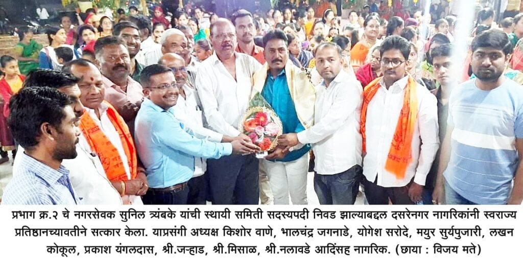 अहमदनगर महानगरपालिकेच्या स्थायी समिती सदस्यपदी प्रभाग क्र.2 चे नगरसेवक सुनिल त्र्यंबके यांची निवड झाल्याबद्दल दसरेनगर येथील स्वराज प्रतिष्ठान व रहिवासीयांनी नागरी सत्कार केला. याप्रसंगी अध्यक्ष किशोर वाणे, राष्ट्रवादीचे शहर जिल्हा अध्यक्ष प्रा. माणिक विधाते, भालचंद्र जगनाडे, योगेश सरोदे, लखन कोकूल, शेखर बनकर, मयुर सुर्यपुजारी, प्रसाद यंगलदास, श्री.जर्‍हाड, श्री.नलावडे आदिंसह नागरिक उपस्थित होते.