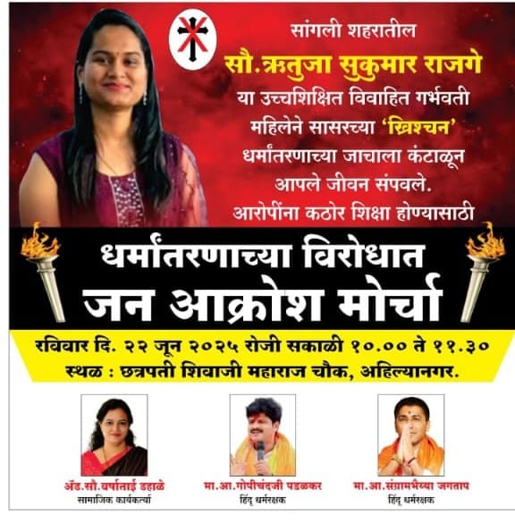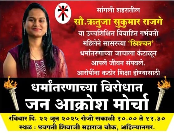 नगर शहरात धर्मांतरणाच्या विरोधात रविवारी (दि. २२ जून) सकाळी १० वाजता एक जनआक्रोश मोर्चाचे आयोजन करण्यात आले आहे. हा मोर्चा ऋतुजा सुकुमार राजगे यांच्या दुर्दैवी आत्महत्येच्या पार्श्वभूमीवर घेतला जात आहे.