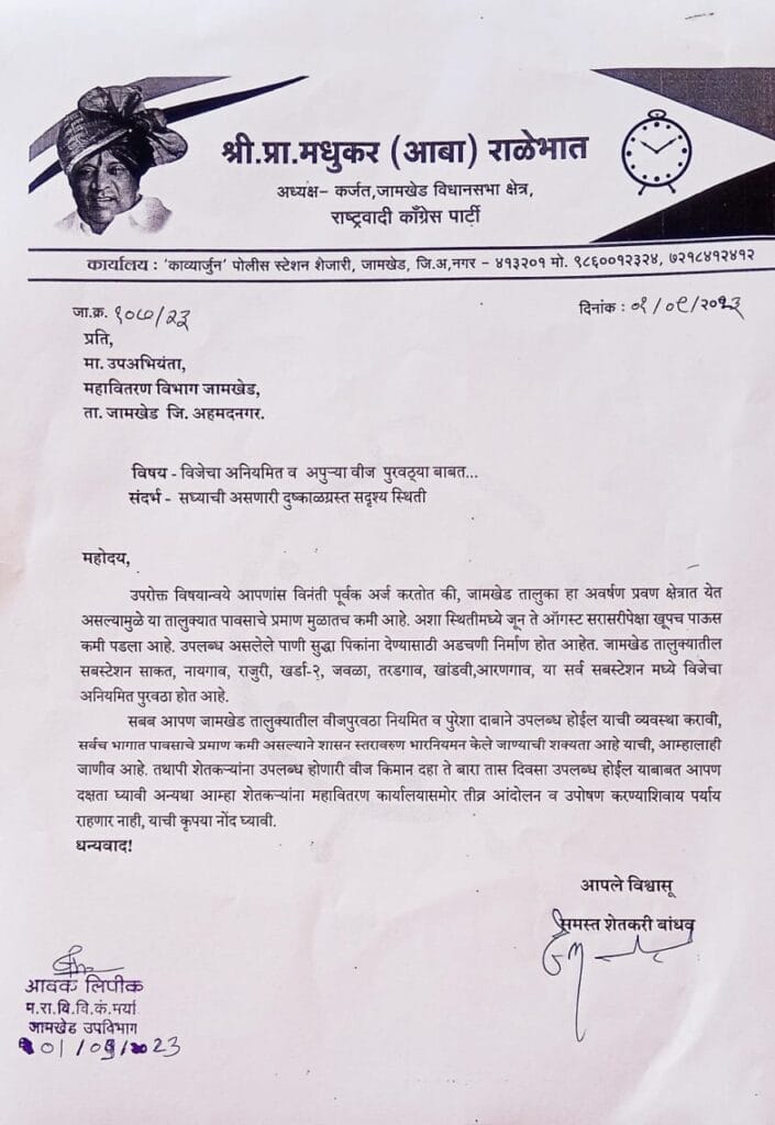 त्यामुळे राष्ट्रवादी काँग्रेस पक्षाने कर्जत जामखेड तालुक्यातील महावितरणच्या कार्यकारी अभियंता आणि उपअभियंता यांना स्वतंत्रपणे निवेदनाद्वारे विजेचा नियमित पुरवठा व पूर्ण दाबाने वीज मिळावी यासाठी शेतकऱ्यांना बरोबर घेऊन विनंती केली आणि उचित निर्णय नाही झाला तर आंदोलनाचा इशारा देखील दिला आहे.