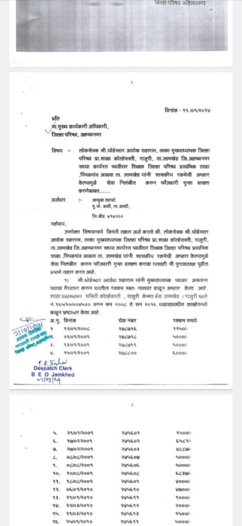 शासकीय रकमेचा अपहार करणारा मुख्याध्यापक अशोक घोडेस्वार याला सेवा निलंबित करून फौजदारी गुन्हा दाखल करा – श्री आश्रूबा लटपटे