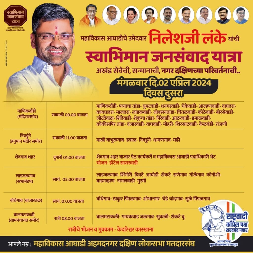 पाथर्डीनंतर इतर तालुक्यांमध्ये या यात्रेचे आयोजन करण्यात आले आहे. दि. १६ एप्रिल रोजी नगर येथील विशाल गणपती मंदीरात या यात्रेचा समारोप होईल. शिवसेना उध्दव बाळासाहेब ठाकरे पक्षाच्या युवा सेनेचे अध्यक्ष आमदार आदीत्य ठाकरे माजी मंत्री तथा काँग्रेस नेते बाळासाहेब थोरात हे यावेळी उपस्थित राहणार आहेत. राष्ट्रवादी काँग्रेस शरदचंद्र पवार पक्षाच्या वतीने शनिवारी नीलेश लंके यांची उमेदवारी जाहिर झाल्यानंतर त्यांनी शनिवारी रात्रीच संगमनेर येथे काँग्रेस नेते, माजी मंत्री बाळासाहेब थोरात यांची भेट घेउन दिड तास चर्चा केली.