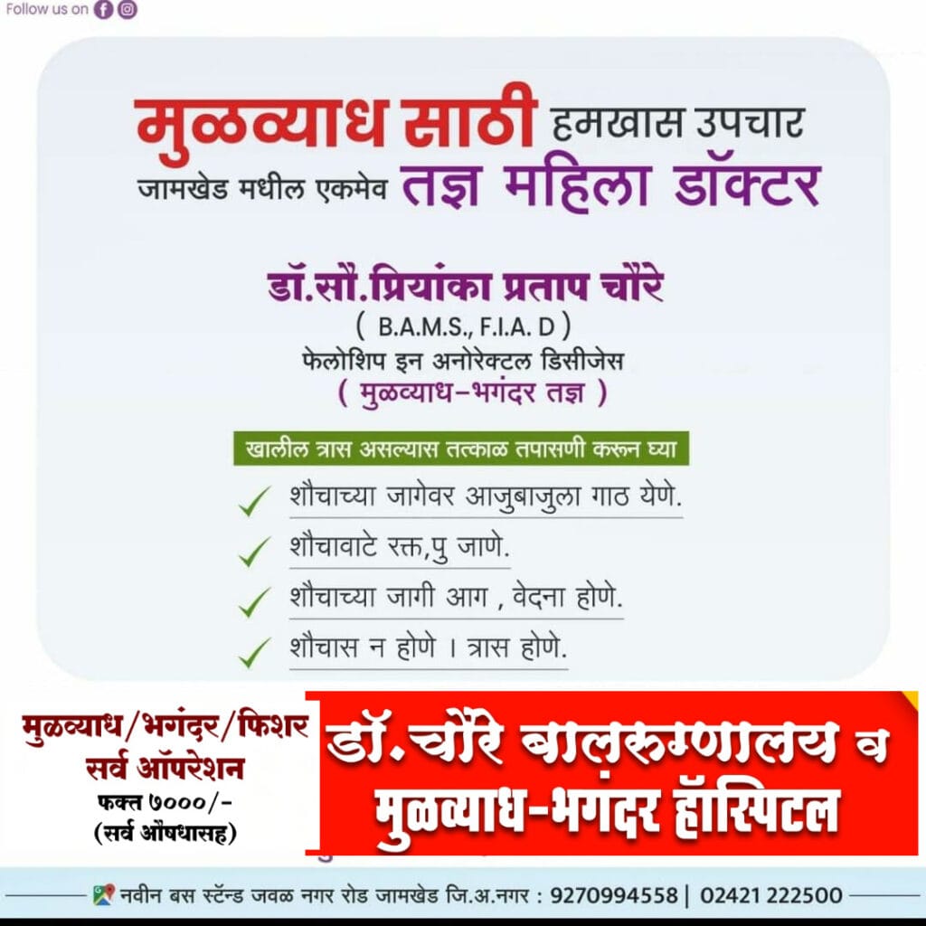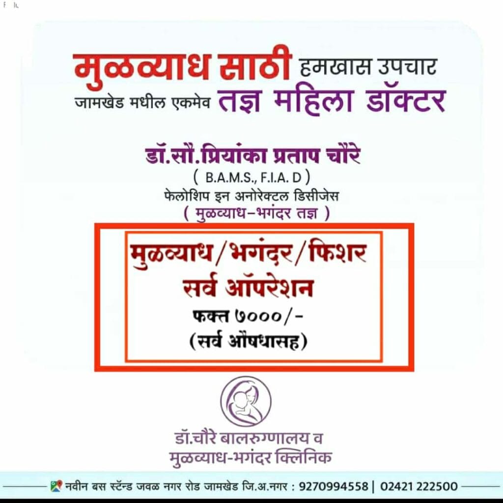 आता जामखेड मध्ये मुळव्याधीच्या Piles सर्व प्रकारच्या त्रासासाठी योग्य निदान व यशस्वी उपचार डॉ.चौरे बालरूग्णालय मुळव्याध भगंदर हाॅस्पिटल येथे करण्यात येत आहे. जामखेड तालुक्यातील एकमेव तज्ञ महिला डॉ.सौ .प्रियंका प्रताप चौरे यांच्या मार्फत मुळव्याध व तत्सम आजारांवरील सर्व आॅपरेशन आता फक्त ७०००हजारांमध्ये येथून पुढे