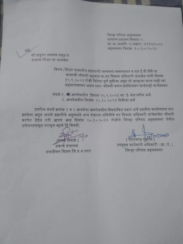जामखेड तालुक्यातील शिऊर गावातील सांडपाणी, घनकचरा व्यवस्थापण व एल ई डी दिवे या कामाची चौकशी अहवाल गट विकास अधिकारी जामखेड यांनी दि. १५/०९/२०२३ रोजी दिलेला पूर्ण चुकीचा असून तो आम्हाला मान्य नाहीत्या अहवाला बाबत आपण स्वत: चौकशी करुन संबंधितावर कार्यवाही करावी.या मागणीचे निवेदन मुख्य कार्यकारी अधिकारी अशिष येरेकर यांना शिवसेना दलित आघाडी चे जामखेड तालुका उपप्रमुख पांडुरंग समुद्र यांनी दिले होते.